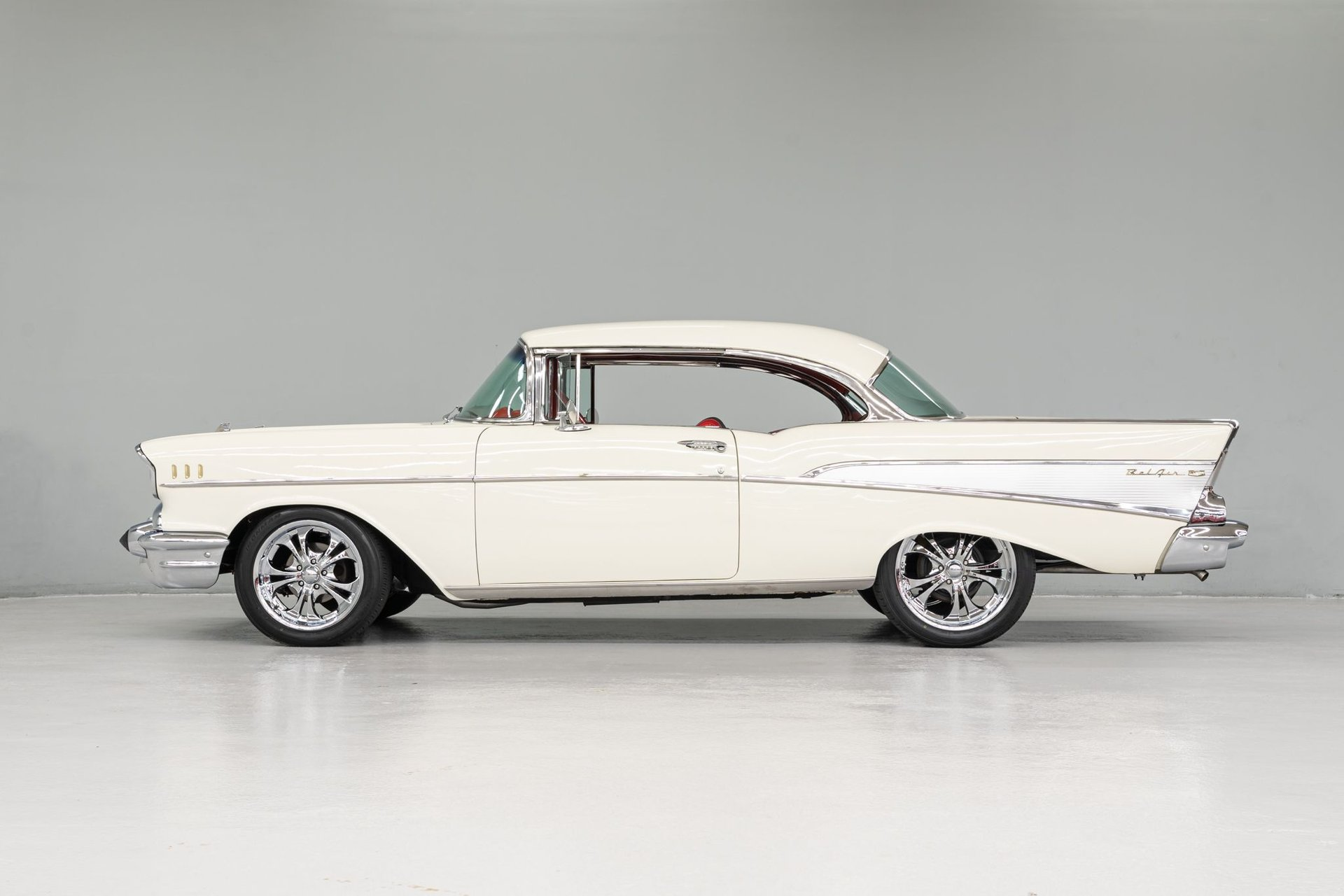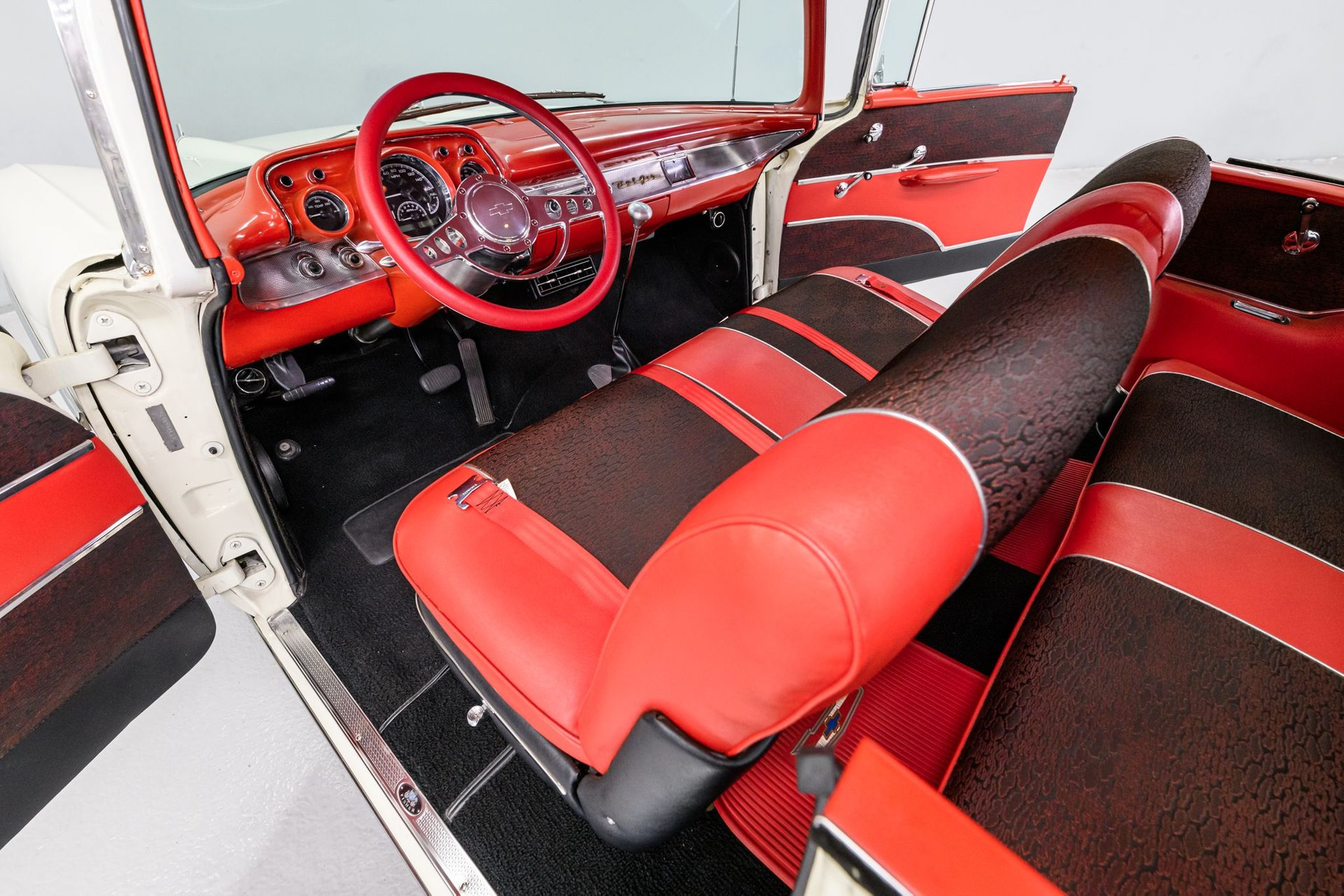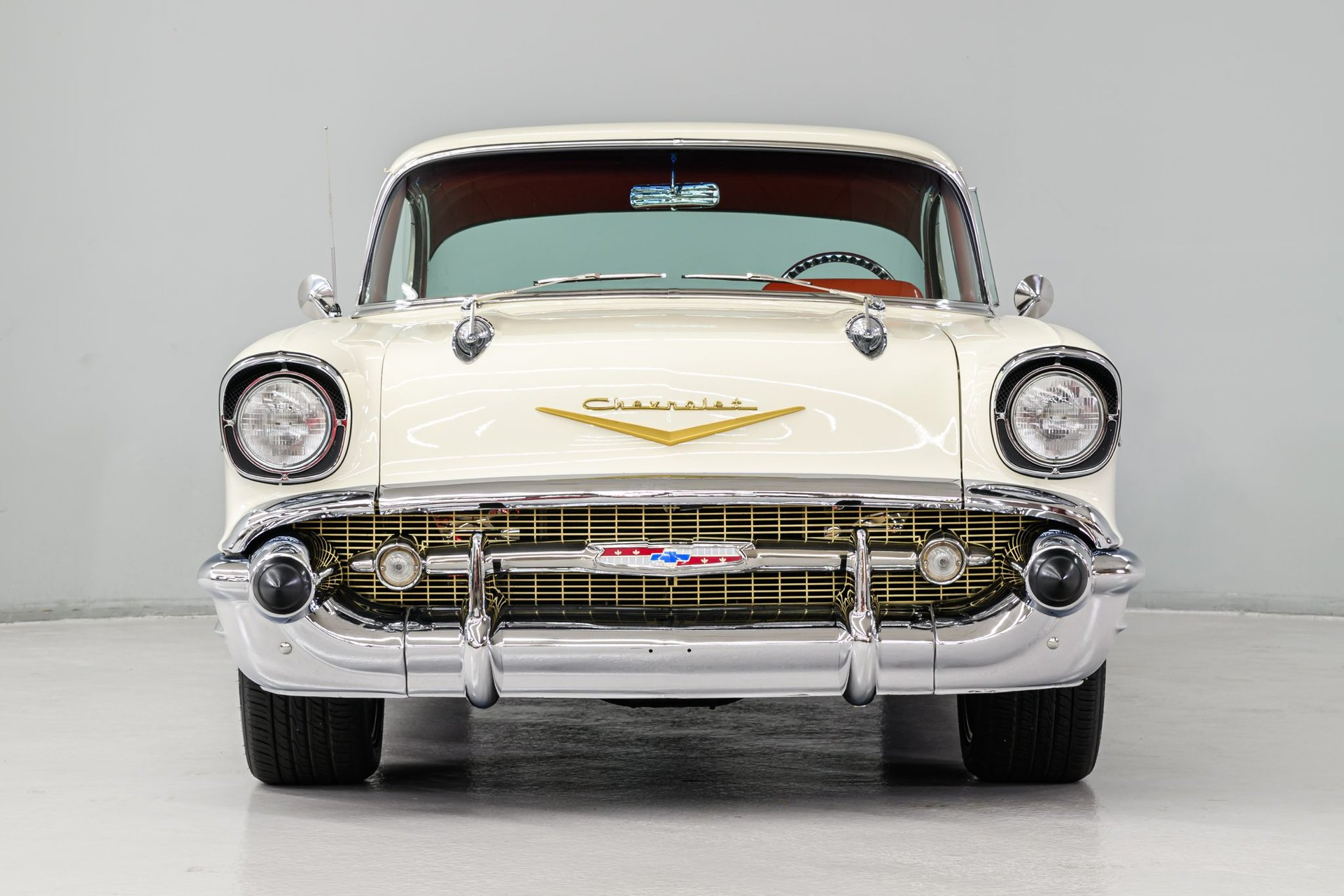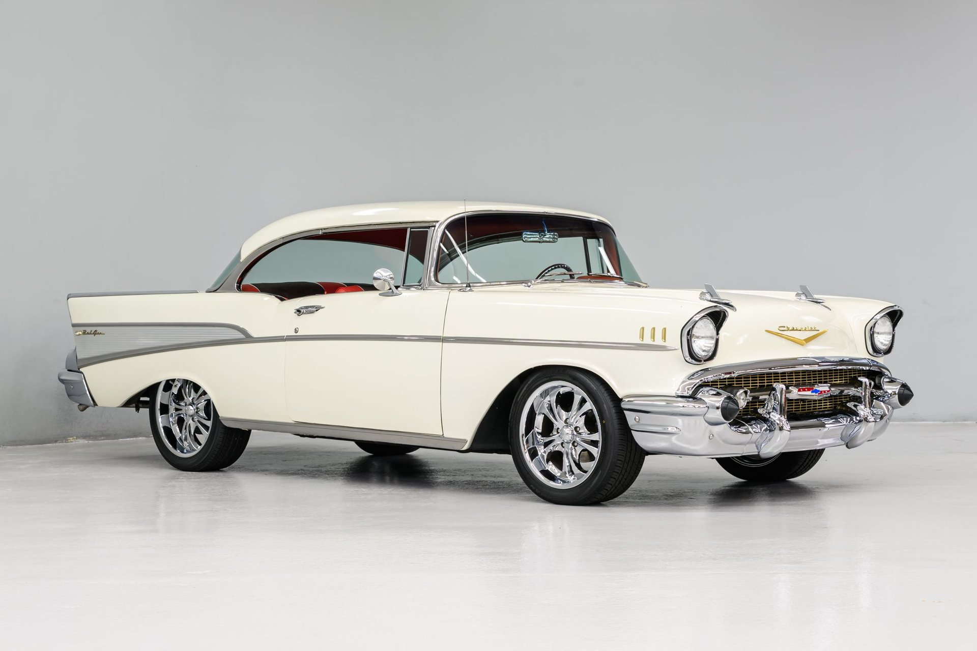 This 1957 Chevy Bel Air is a classic tri-five Chevrolet that was fully restored in 2018. The 2-door hardtop is a perfect example of a Chevrolet icon - strikingly original with strategic upgrades. The 2-stage Cool Vanilla exterior (Chrysler color) was professionally sprayed and is in excellent condition. All deluxe chrome/stainless is in excellent condition. Front bumper guards and Bel Air 'gold accent' trim pieces complete the stunning exterior package. Boss chrome alloy wheels (18x7'f/20x8”r) mount Ironman performance radial tires. The only thing that rivals the exterior is the completely restored red/black interior. Every detail has been addressed. Door cards, dash, headliner – everything is outstanding. The factory gauge cluster has been replaced with a Dakota Digital analog gauge package and a tilt wheel assembly mounts a custom alloy wheel. Sounds are provided by an aftermarket AM/FM/Cassette stereo system. Upgraded two-speed electric wipers have also been fitted.