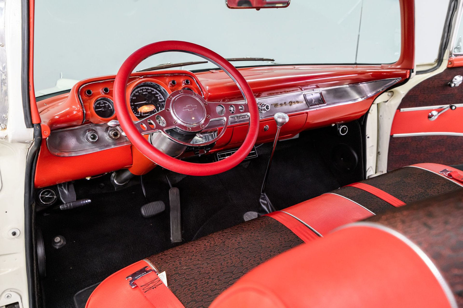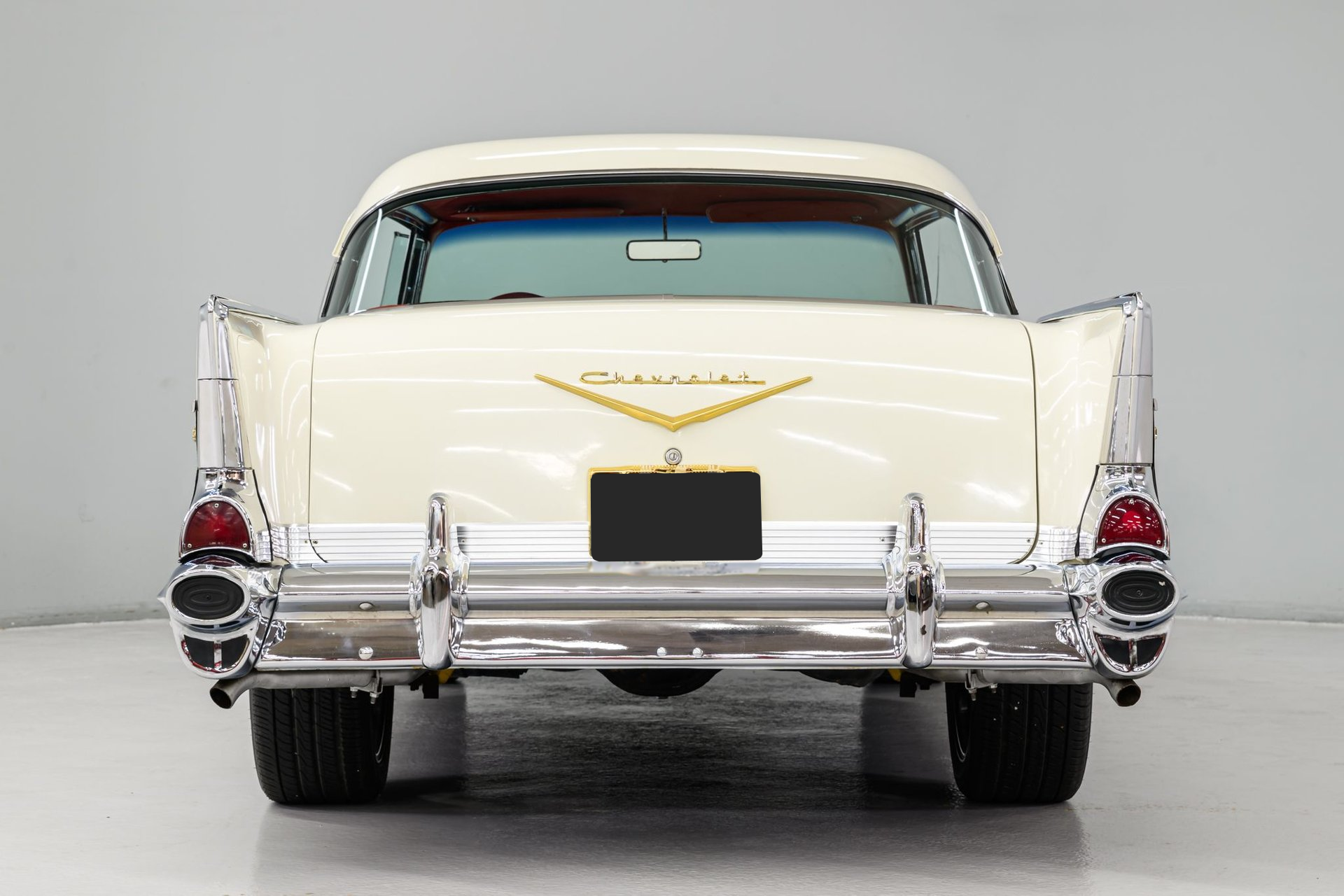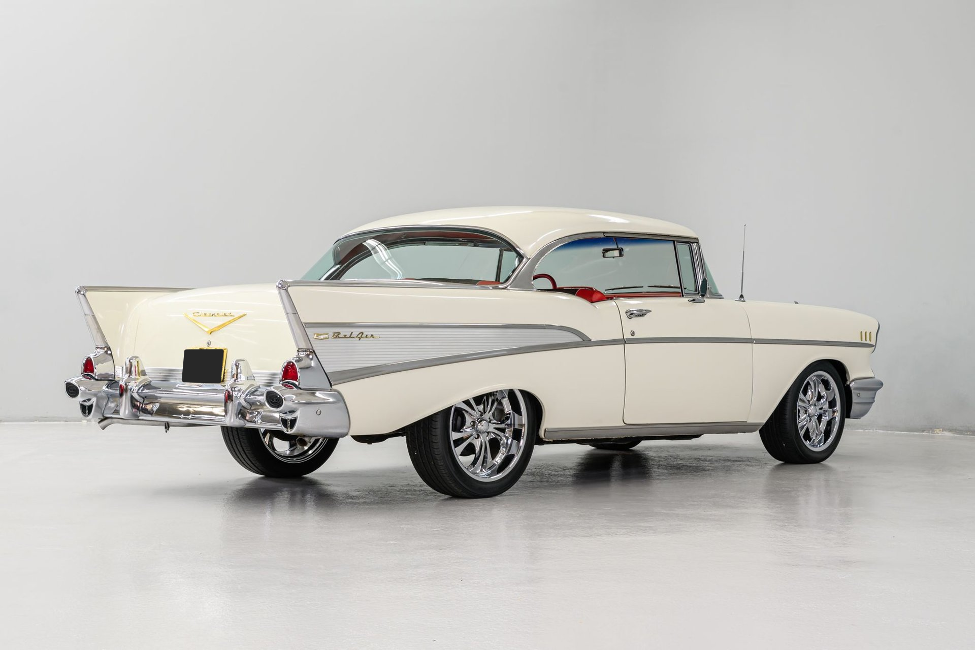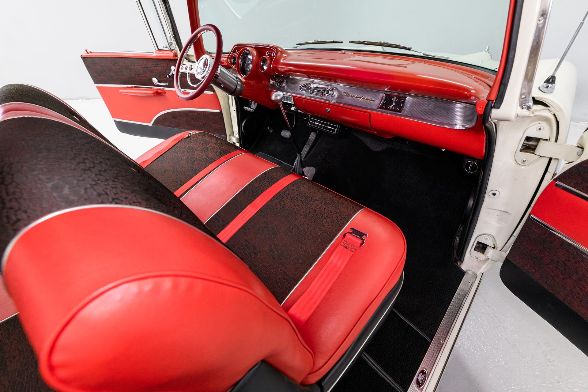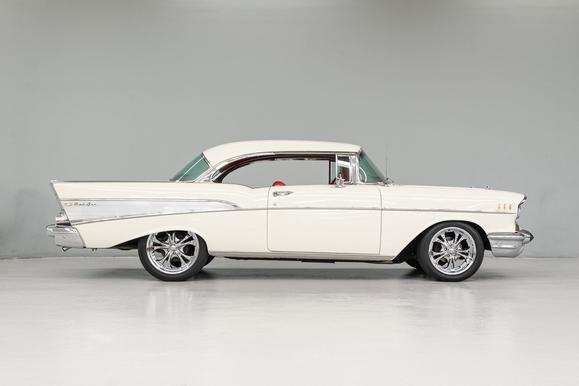 This 1957 Chevy Bel Air is a classic tri-five Chevrolet that was fully restored in 2018. The 2-door hardtop is a perfect example of a Chevrolet icon - strikingly original with strategic upgrades. The 2-stage Cool Vanilla exterior (Chrysler color) was professionally sprayed and is in excellent condition. All deluxe chrome/stainless is in excellent condition. Front bumper guards and Bel Air 'gold accent' trim pieces complete the stunning exterior package. Boss chrome alloy wheels (18x7'f/20x8”r) mount Ironman performance radial tires. The only thing that rivals the exterior is the completely restored red/black interior. Every detail has been addressed. Door cards, dash, headliner – everything is outstanding. The factory gauge cluster has been replaced with a Dakota Digital analog gauge package and a tilt wheel assembly mounts a custom alloy wheel. Sounds are provided by an aftermarket AM/FM/Cassette stereo system. Upgraded two-speed electric wipers have also been fitted.