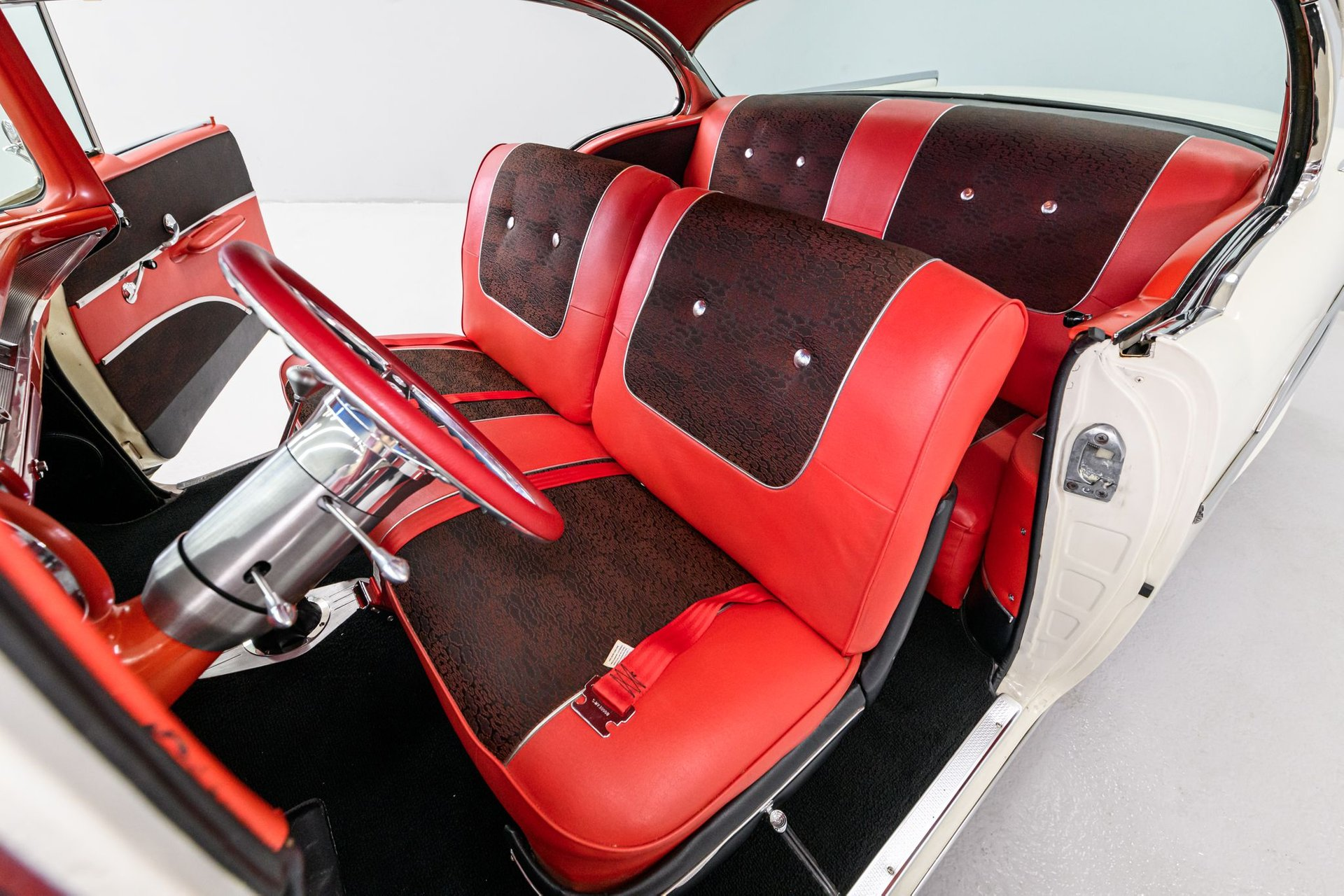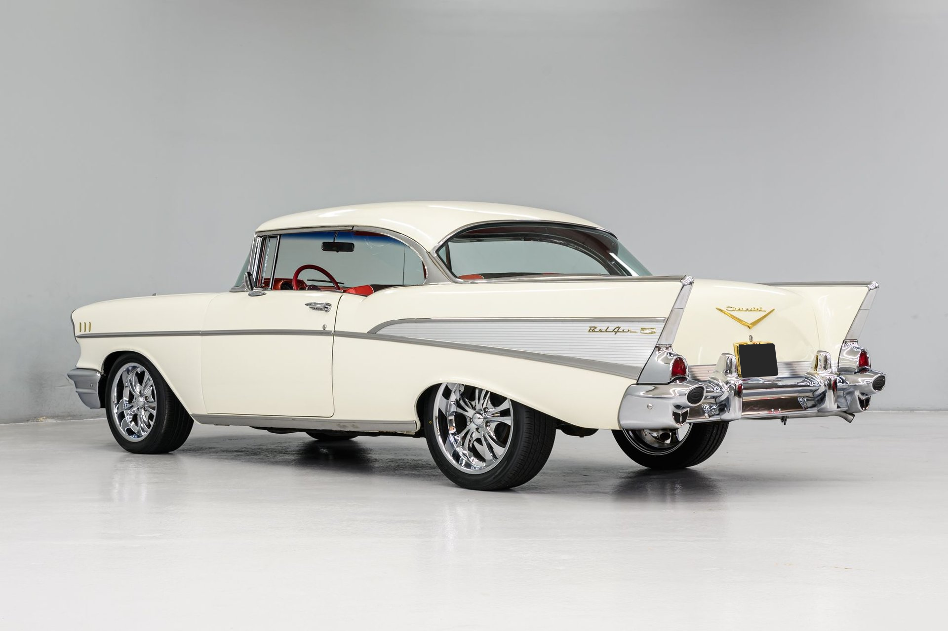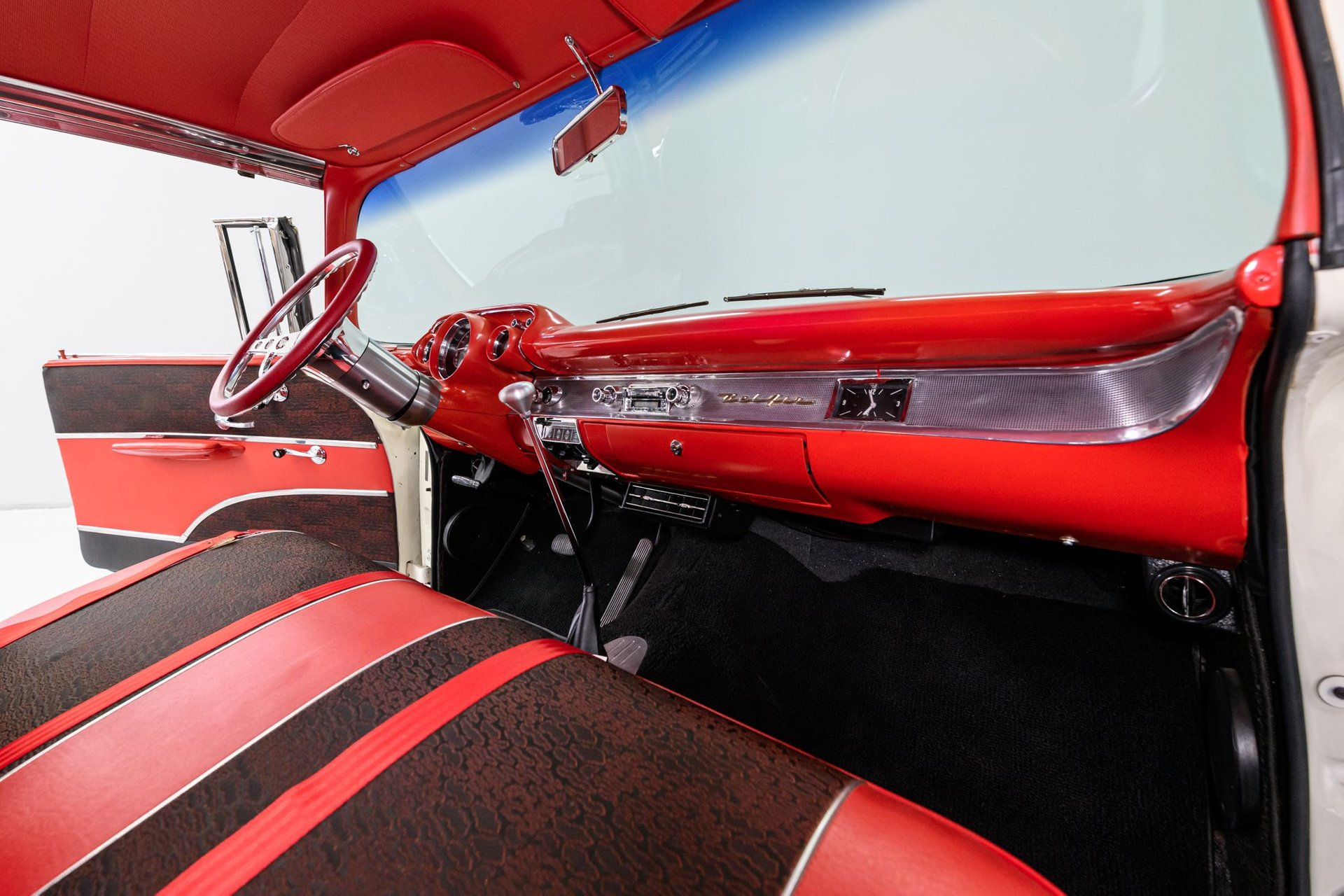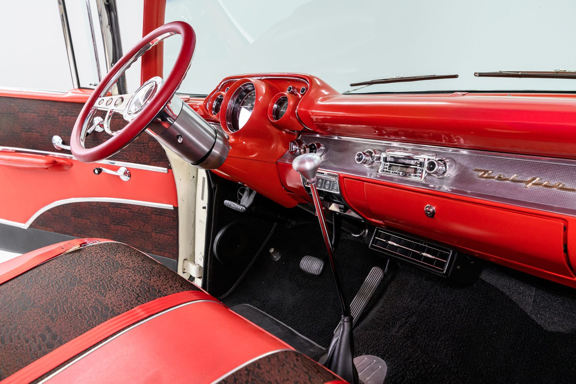 This 1957 Chevy Bel Air is a classic tri-five Chevrolet that was fully restored in 2018. The 2-door hardtop is a perfect example of a Chevrolet icon - strikingly original with strategic upgrades. The 2-stage Cool Vanilla exterior (Chrysler color) was professionally sprayed and is in excellent condition. All deluxe chrome/stainless is in excellent condition. Front bumper guards and Bel Air 'gold accent' trim pieces complete the stunning exterior package. Boss chrome alloy wheels (18x7'f/20x8”r) mount Ironman performance radial tires. The only thing that rivals the exterior is the completely restored red/black interior. Every detail has been addressed. Door cards, dash, headliner – everything is outstanding. The factory gauge cluster has been replaced with a Dakota Digital analog gauge package and a tilt wheel assembly mounts a custom alloy wheel. Sounds are provided by an aftermarket AM/FM/Cassette stereo system. Upgraded two-speed electric wipers have also been fitted.