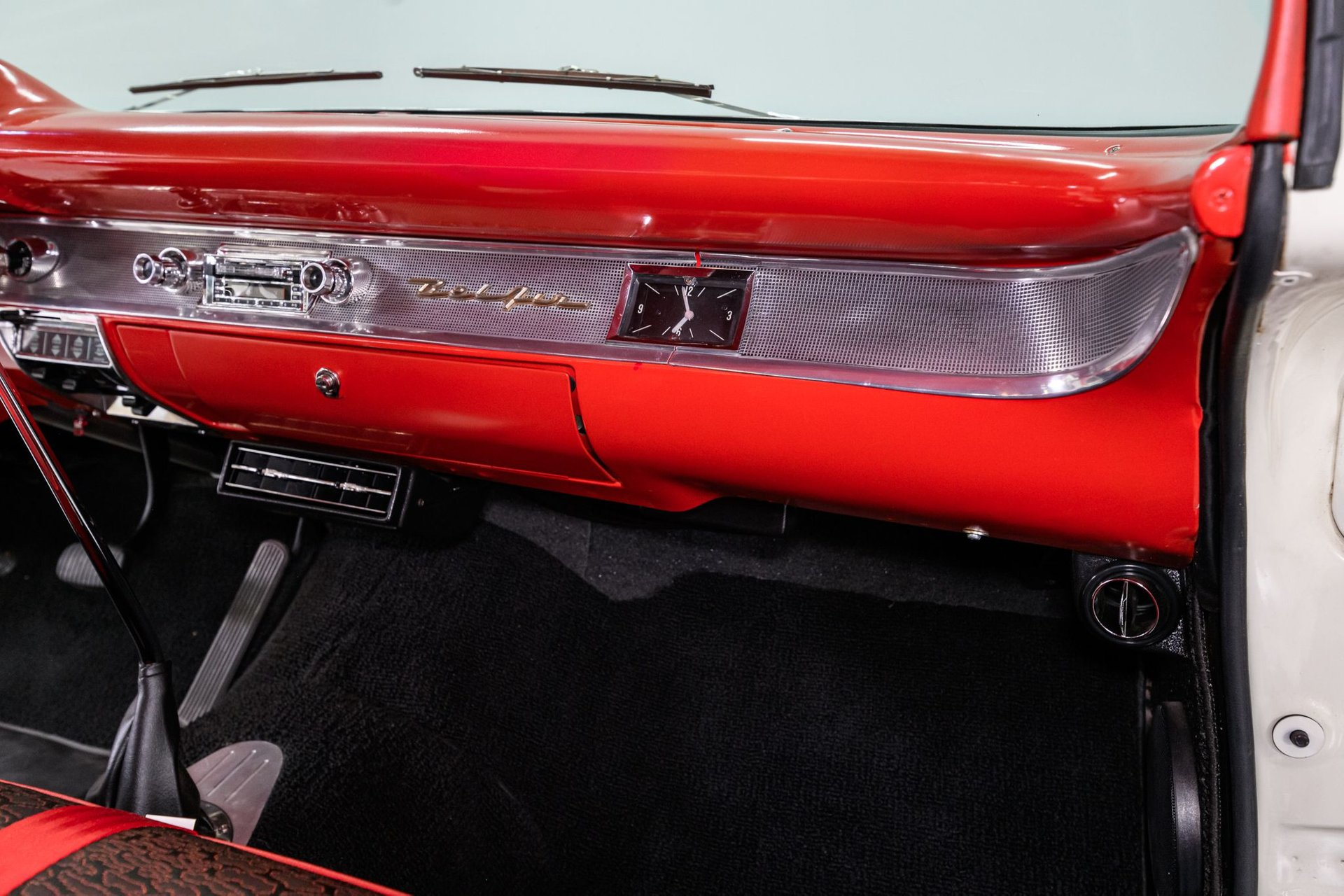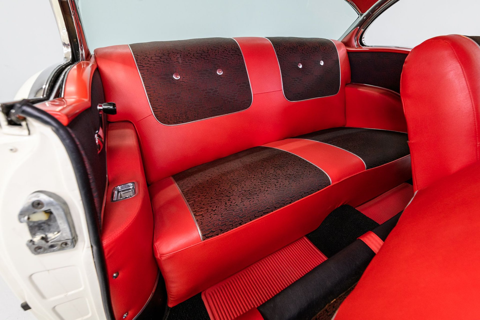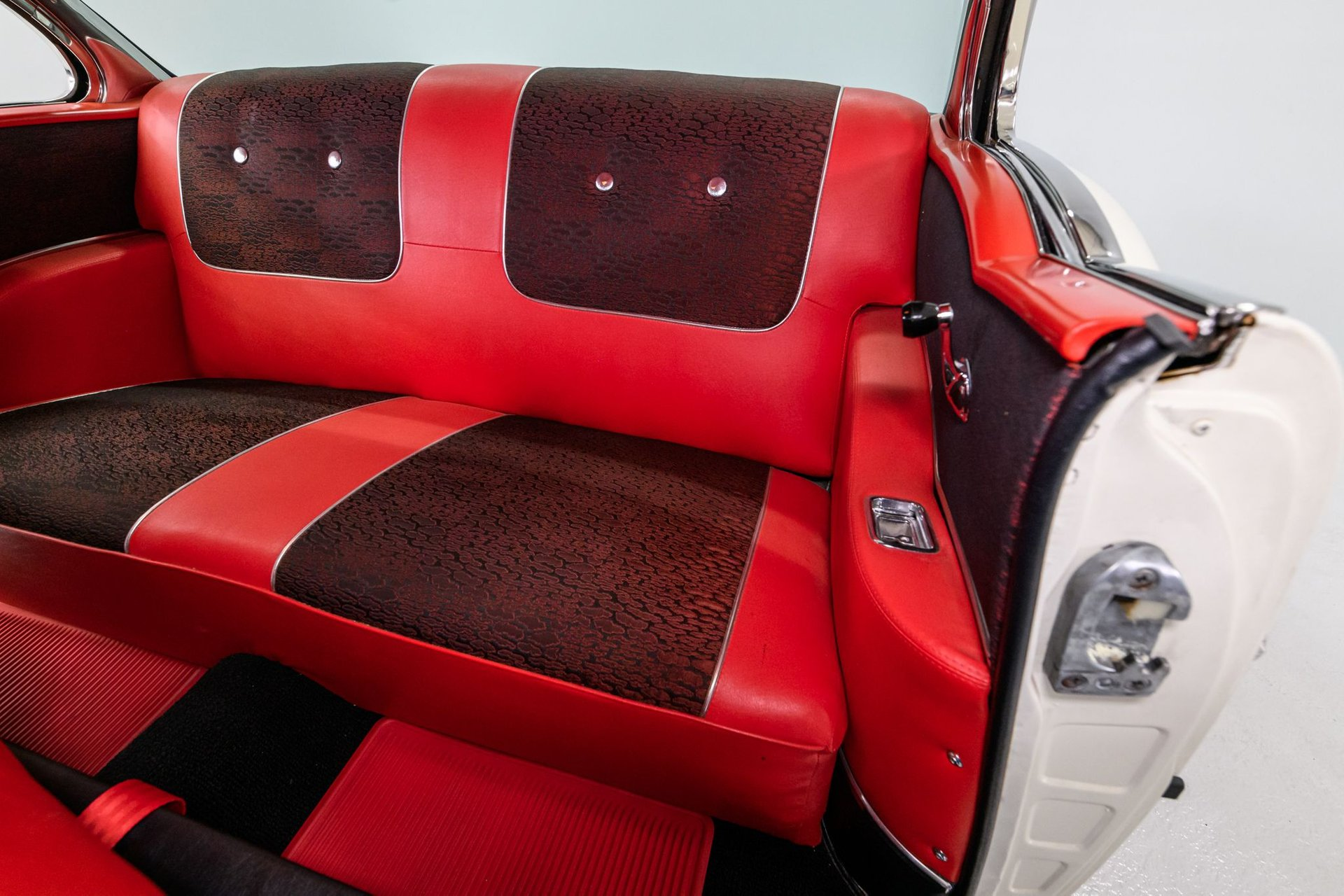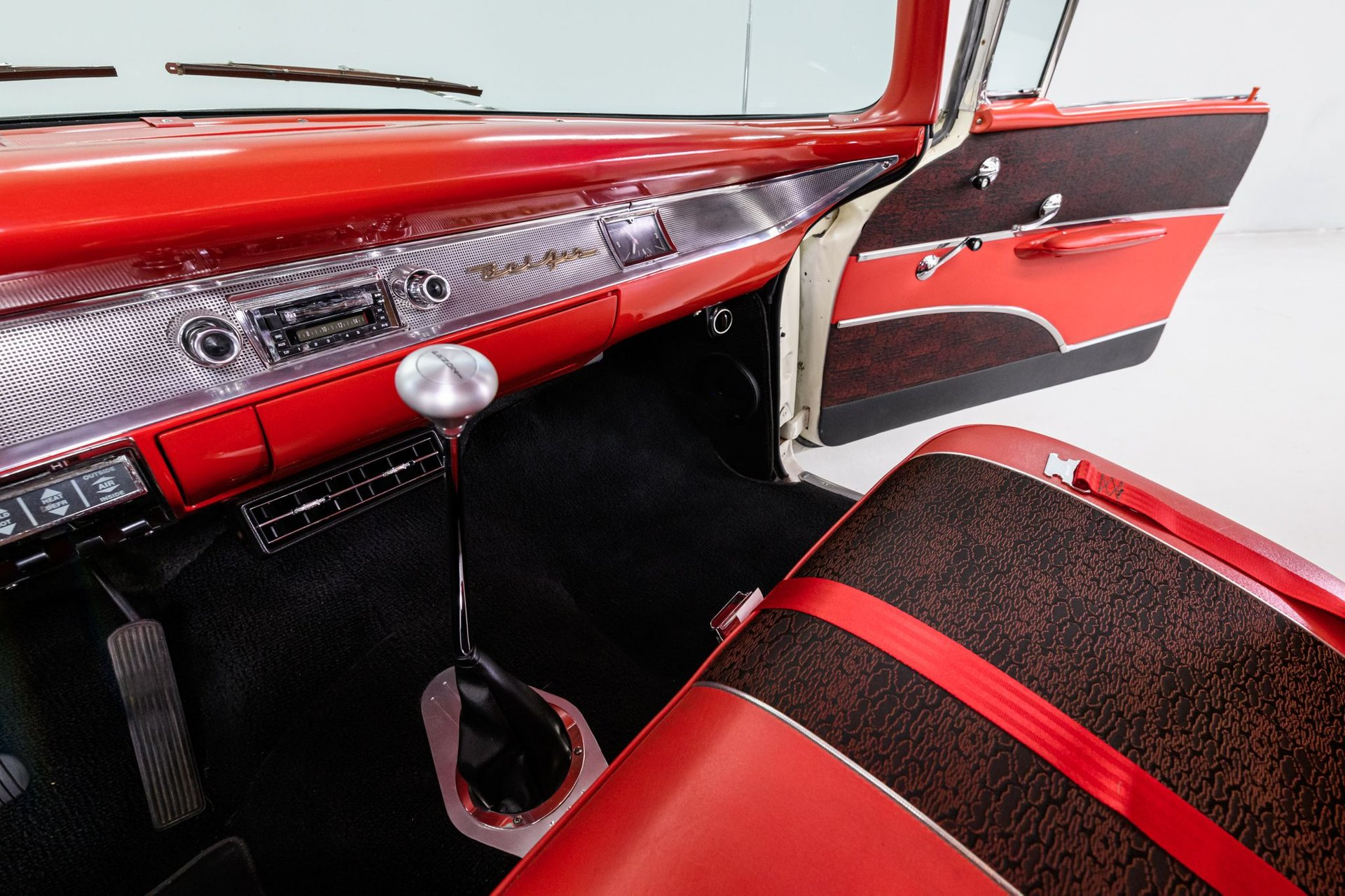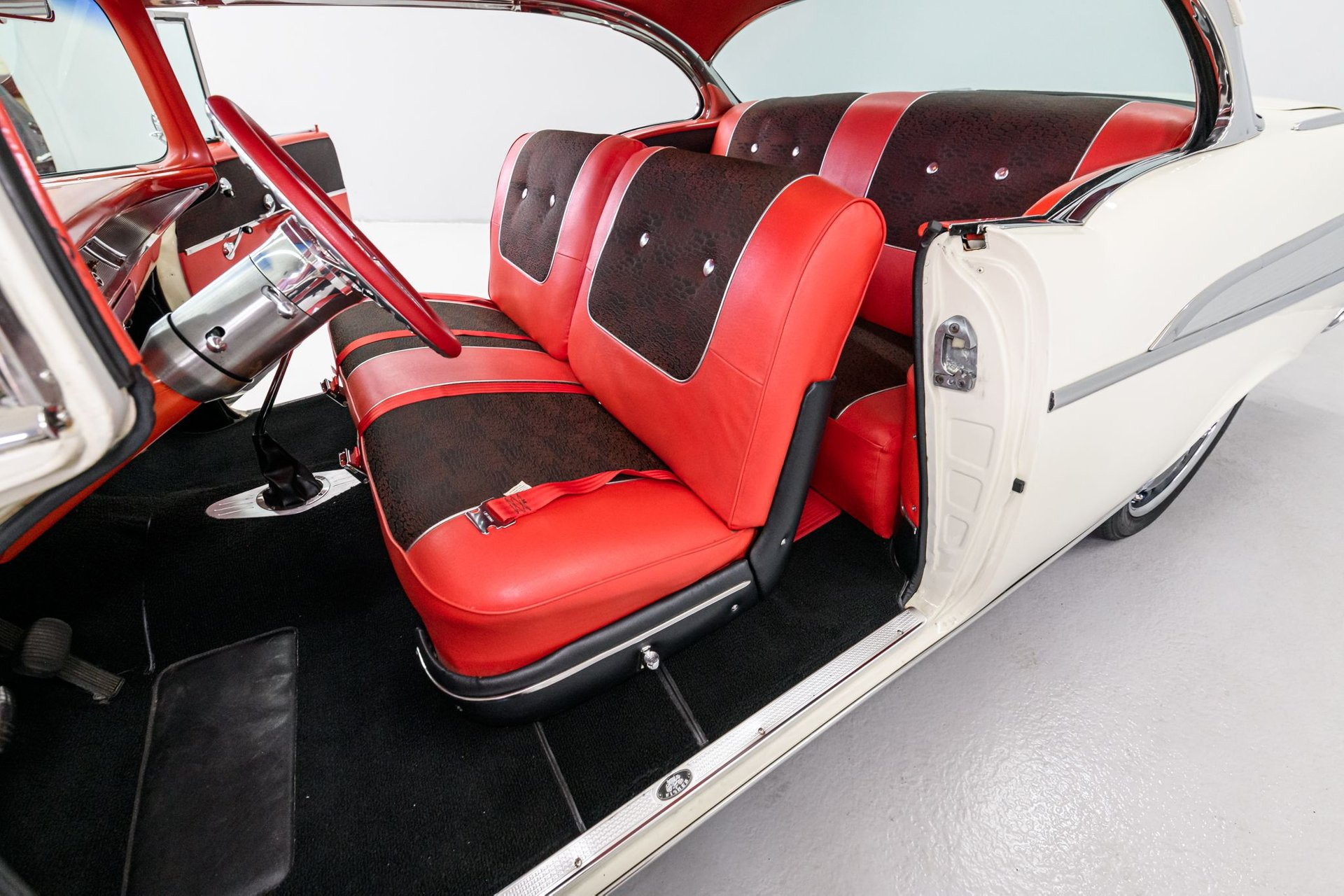This 1957 Chevy Bel Air is a classic tri-five Chevrolet that was fully restored in 2018. The 2-door hardtop is a perfect example of a Chevrolet icon - strikingly original with strategic upgrades. The 2-stage Cool Vanilla exterior (Chrysler color) was professionally sprayed and is in excellent condition. All deluxe chrome/stainless is in excellent condition. Front bumper guards and Bel Air 'gold accent' trim pieces complete the stunning exterior package. Boss chrome alloy wheels (18x7'f/20x8”r) mount Ironman performance radial tires. The only thing that rivals the exterior is the completely restored red/black interior. Every detail has been addressed. Door cards, dash, headliner – everything is outstanding. The factory gauge cluster has been replaced with a Dakota Digital analog gauge package and a tilt wheel assembly mounts a custom alloy wheel. Sounds are provided by an aftermarket AM/FM/Cassette stereo system. Upgraded two-speed electric wipers have also been fitted.