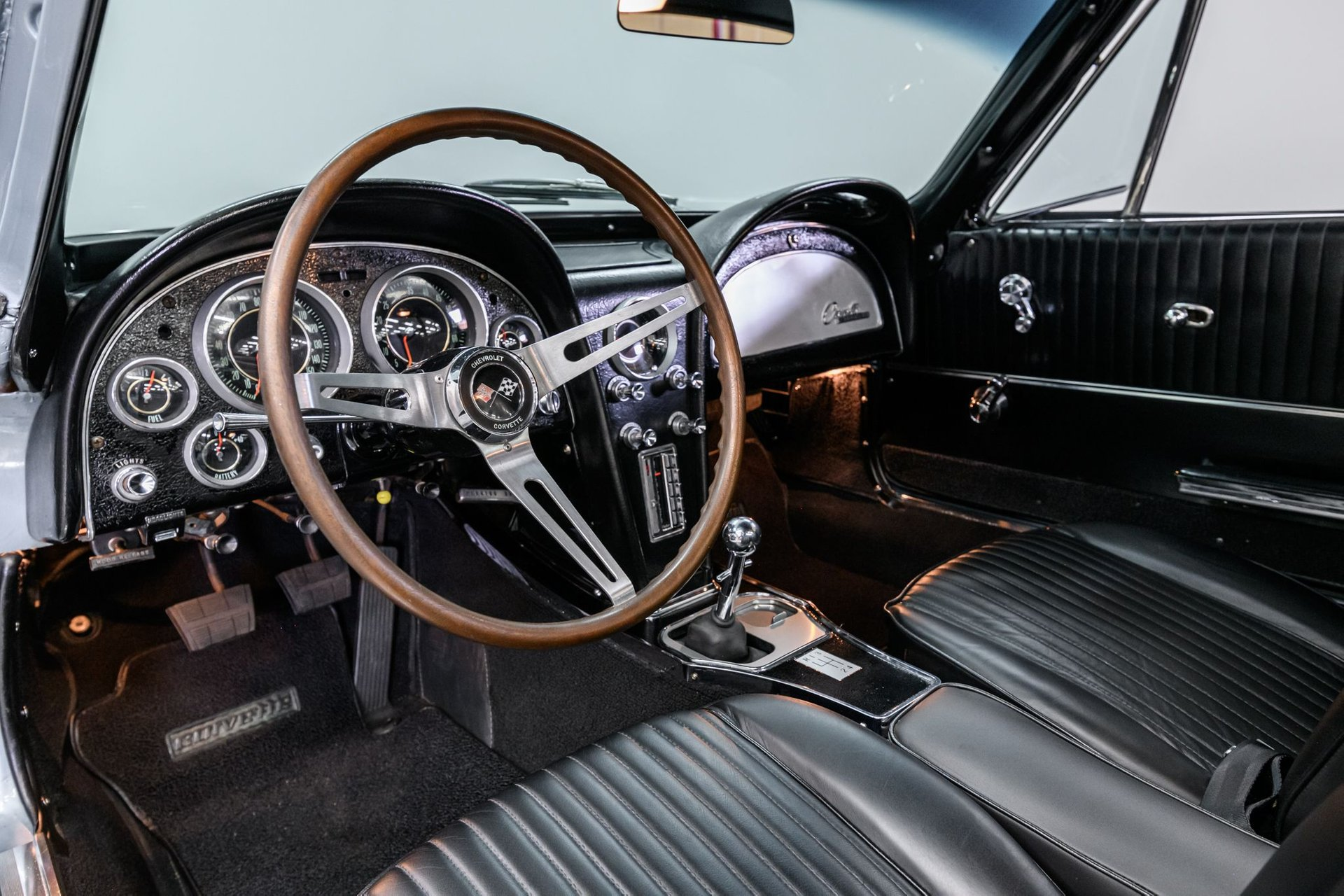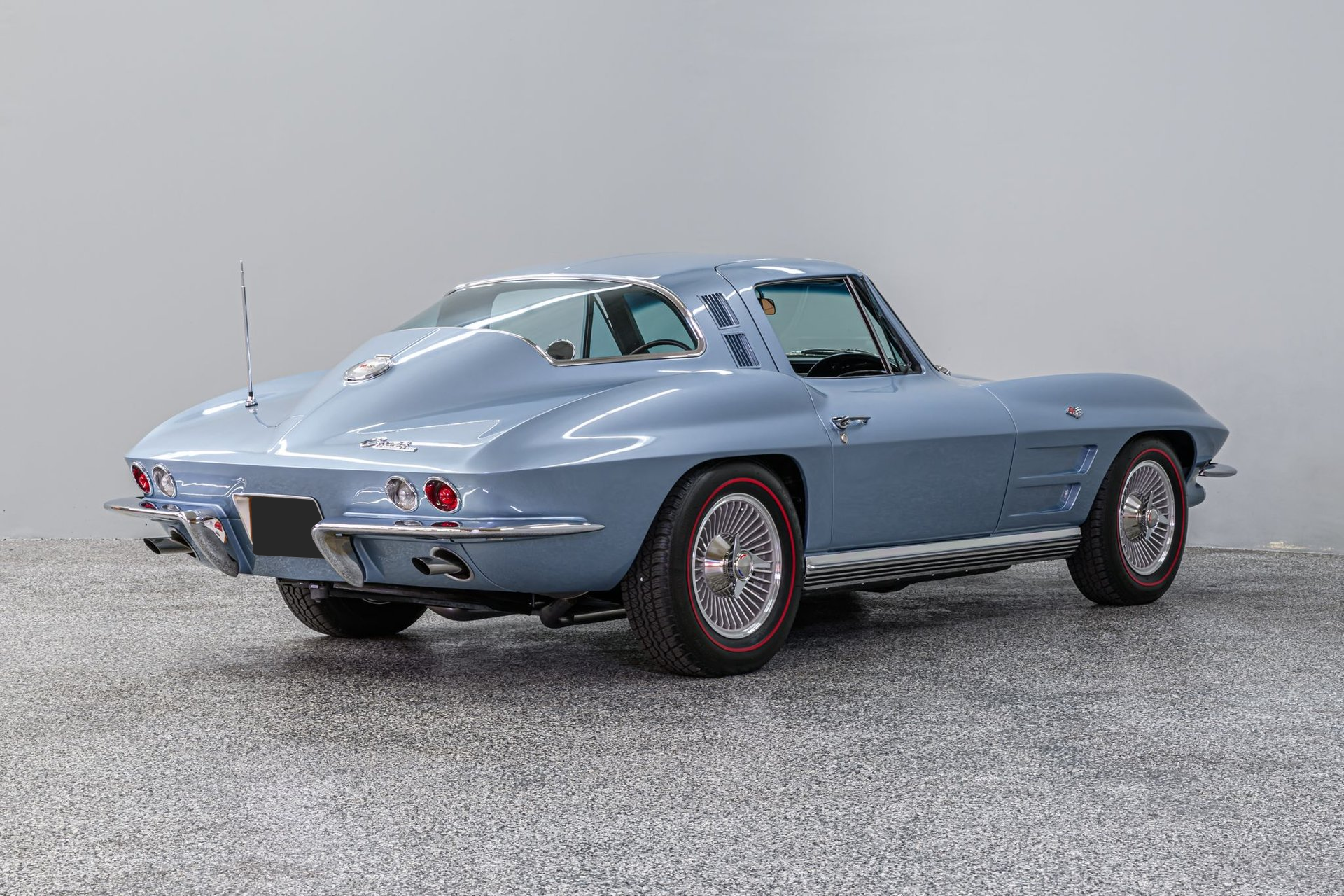 Chevrolet introduced the first Stringray in 1963, the 'Split Window' coupe. In the three model years following, the look remained basically the same, sans the 'split'. This fully restored 1964 Stringray coupe is a perfect example of the car that 'stole the show' in the mid '60s. Our owner has provided photos to show that the entire drivetrain is matching numbers and the engine block/trans case are stamped with last six digits of the VIN. The professional restoration of the exterior is superb and the Silver-Blue finish (original color) is accented with reproduction knock-off style alloy wheels and redline BFG Silvertown radial tires (factory wheels/hubcaps are included). The fully restored black leather interior is virtually perfect. (According to the trim code, the original interior was Medium Blue vinyl, so this was a total refurb.) There is an AM/FM radio, beautiful faux wood grain wheel, new windshield, new weather stripping and all gauges including the clock are functional. The 327/365hp motor was professionally rebuilt in 2015. This was a top performer in '64 – only the fuelie, rated at 375hp, was more powerful (and temperamental). Every detail is factory including Corvette alloy valve covers, distributor w/gear-drive tach, rams-horn exhaust manifolds and chrome shielding. The motor is backed by the original Muncie 4-speed close-ratio transmission w/Muncie shifter and the differential coding indicates 3.70:1 performance gearing. The chassis features manual steering and power drum brakes. Suspension, brake and exhaust components have been renewed. If you are looking for a carefully restored Corvette C2, you need to inspect this Stingray - you will not be disappointed.