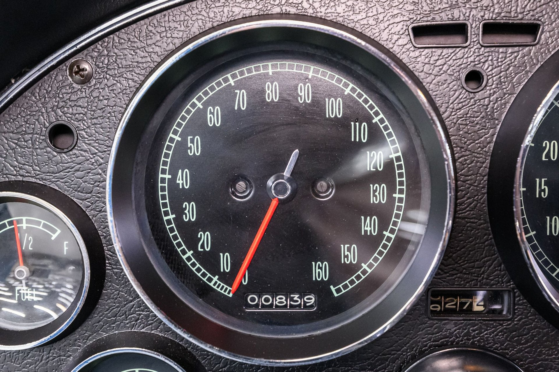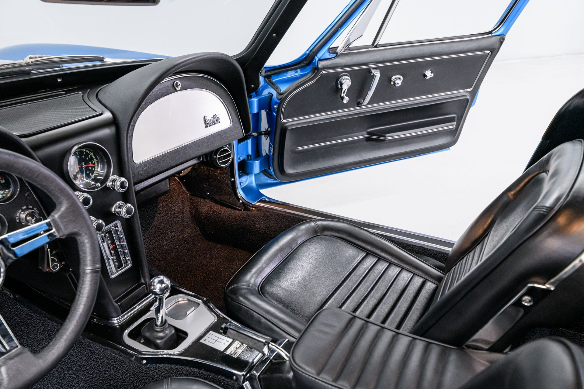 The beautiful body has virtually perfect gaps and was carefully prepped. It was then professionally refinished in two-stage Marina Blue (976) with a '427 'Stinger' hood, a perfect accent to this stunning coupe. Chrome and stainless are outstanding. Original chrome-covered side pipes, one-off Alumacraft grill and stunning new 17” Boyd Coddington Speedster rims complete the exterior package. The black vinyl interior has also beenmeticulously restored to original and is outstanding. Features include Vintage A/C, power window, smoked glass, new trim pads/panels and a raging Autosound Vette stereo system w/Bluetooth. Under the hood, the owner states that the coupe is powered by a Chevy 427/435bhp big-block - not the original engine 427, but an L71/L89. The engine received a professional rebuild and is fitted with aluminum heads and tri-power Holley carburetors. It sounds great through the original side-mount exhaust.