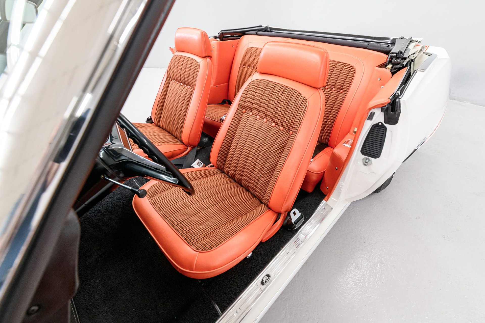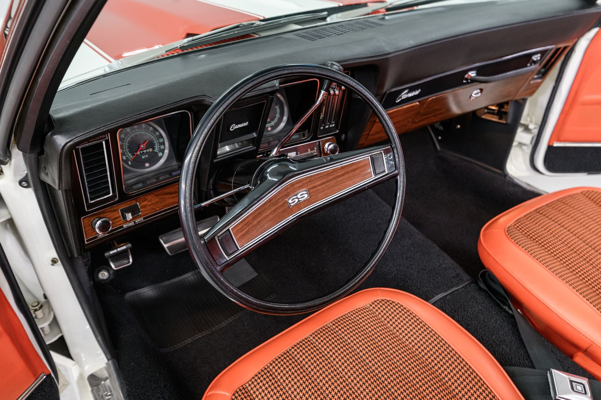 The body/floor panels (all original) were carefully prepped and all gaps are outstanding. The body was professionally finished in the Indy Pace Car colors of Dover White (code 50A) with Orange hood, deck (Z28 style) and fender trim (code 720). There is a ZL2 functional cowl induction hood and a subtle rear spoiler. All Pace Cars were factory optioned with the Rally Sport/Super Sport accent packages that added hide-away headlights, simulated rear fender louvers and taillight trim. (It is worth noting that the hide-away headlights on this Camaro use with the originally designed vacuum system, not aftermarket electric motors.) This convertible does not have the 'Indy 500' decals on the doors, a dealer installed option that many folks deleted. It sits beautifully on original 14” GM/Kelsey Rally wheels with Firestone Indy 500 radial tires. A fully restored interior looks better than new – it is stunning. This interior (code 720) was available only in the Indy 500 Pace Car version and spotlighted orange 'houndstooth' upholstery and door panels. Other features include an S/S wheel, tinted windows, manual white convertible top and original, working AM radio. Horsepower is furnished by what is said to be the matching numbers 350ci/300hp small-block that has not been rebuilt and appears to be as factory. It is equipped with a date-coded, non-original Quadrajet 4V carburetor. (This is a rare Quadrajet as it was manufactured by Carter, not Rochester.) Torque is delivered by a 3-speed Turbo Hydra-matic transmission to a 12-bolt non-positraction differential w/3.07:1 gears (code BL). The owner believes these too are also original components. The spotless chassis is equipped with power steering and power disc/drum brakes w/dual master. This Camaro is Bowtie history that will only become more valuable over time. You will not go wrong with this distinctive 'Indy 500 Pace Car' as an investment and special driving experience.