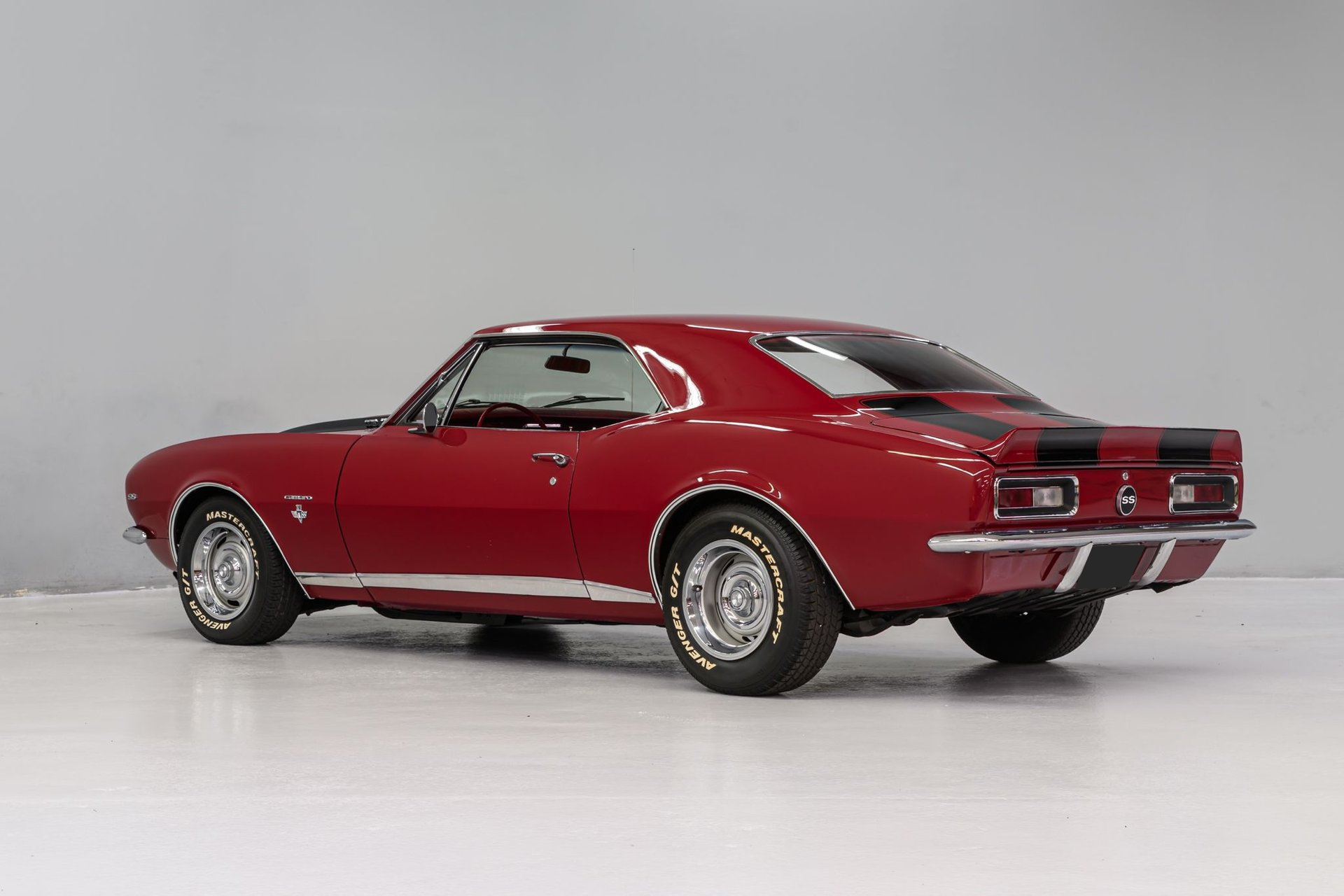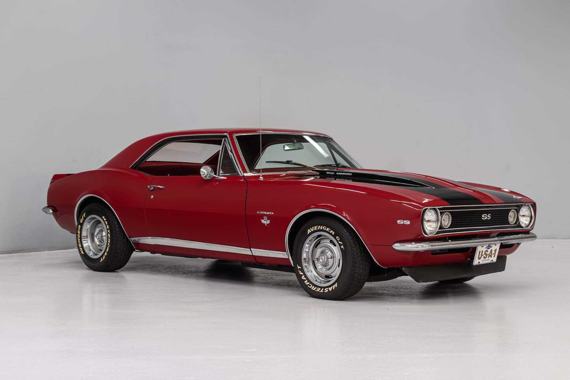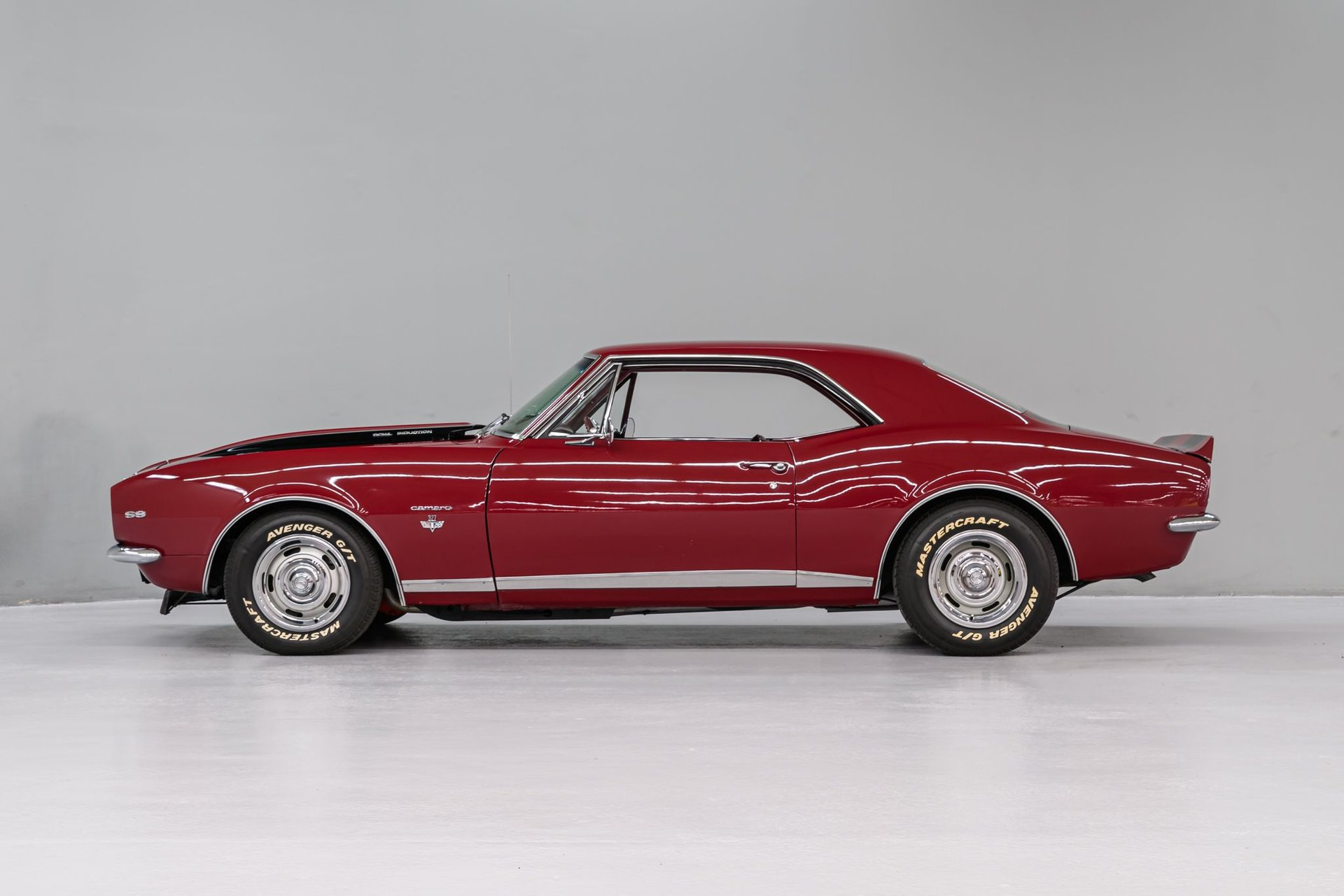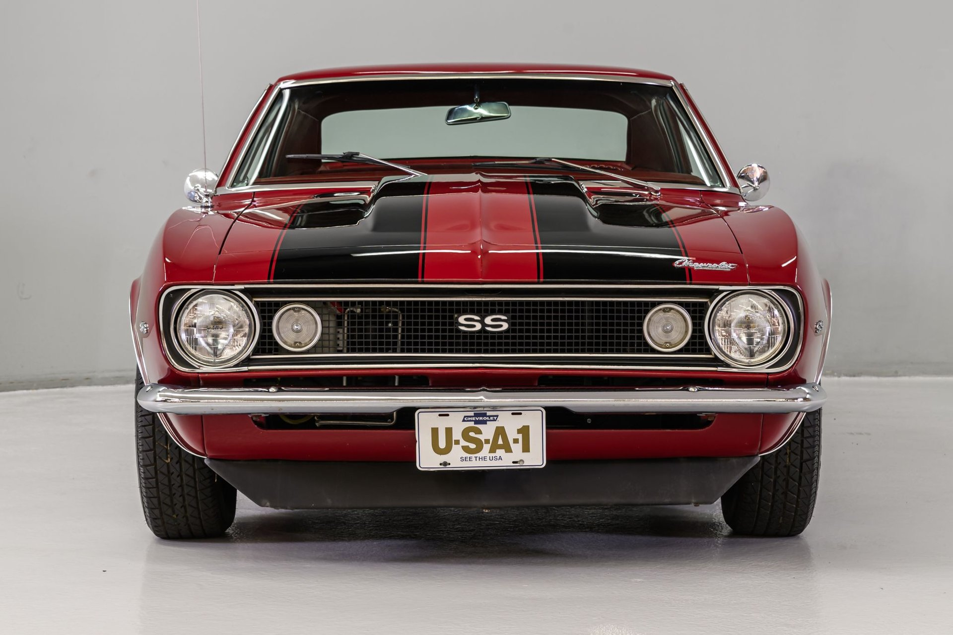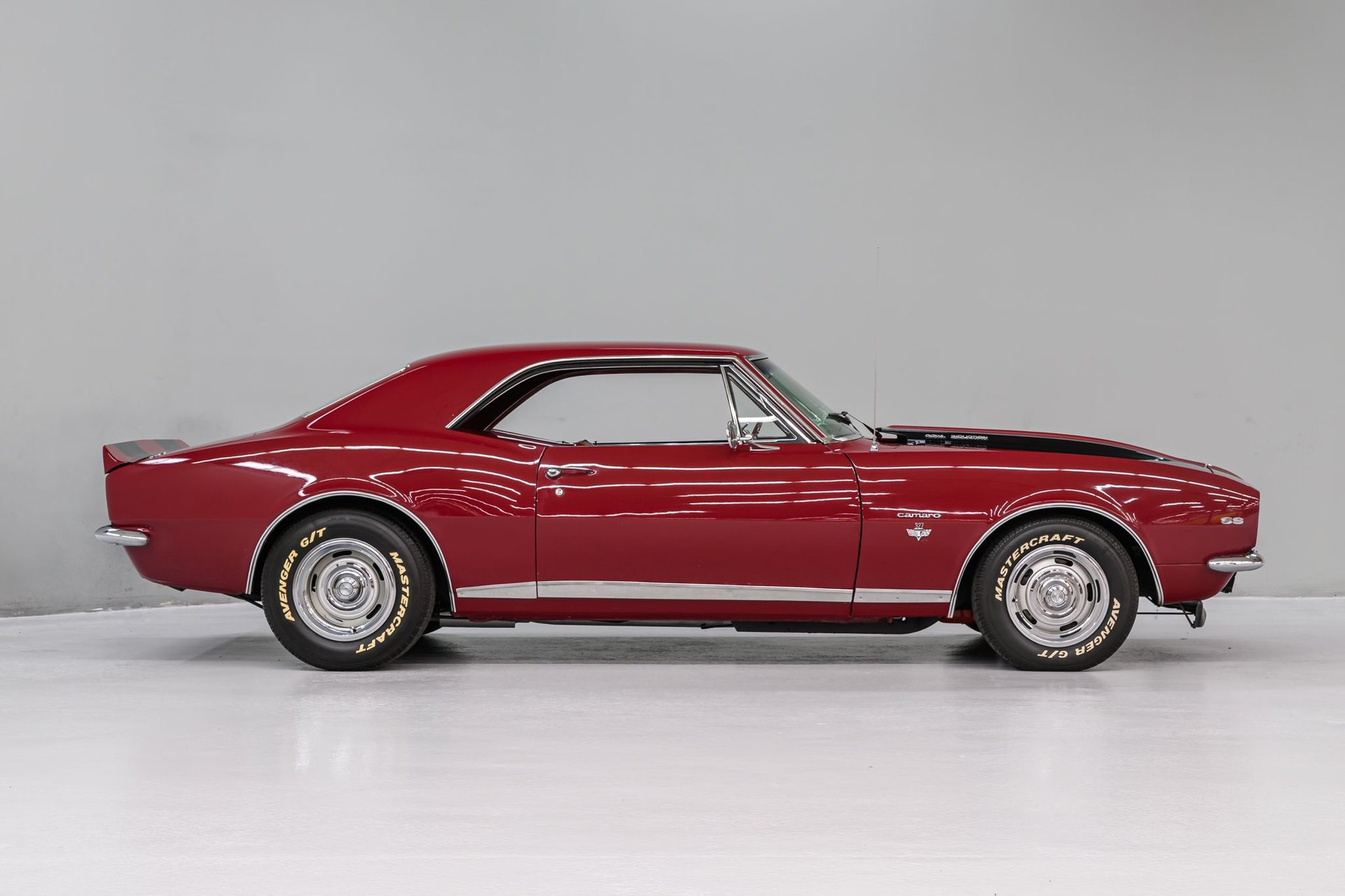 The Chevy Camaro was an instant success when introduced in 1967 and our fully restored (2015) coupe is a stunning example of this special GM lore. The current owner believes that the Camaro was an SS model from the factory, but we cannot document for sure. The Camaro was manufactured in October 1966 at the Norwood Ohio plant and they did not put any 'SS' designation on their trim tag until later in the '67 production cycle. Whether it is a factory SS or not, it is beautiful Camaro with SS performance. Originally a Bolero Red car, it has been professionally refinished in a Deep Burgundy with Black 'Z-28' accent stripes, cowl induction hood and rear spoiler. GM Rally wheels mount white letter performance radials. Our Camaro looks great from any angle – check the photos again. The restored red vinyl interior looks every bit as good as the original. Options and features include: Sanden A/C, center console, Muncie shifter, tinted windows and Pioneer AM/FM/Cassette sound system. Horsepower is said to come from a rebuilt 327ci small-block. It has been dressed-up and fitted with an Edelbrock aluminum intake/carburetor and mild street cam. Torque is delivered through a 4-speed manual transmission to a 10-bolt rear differential. The chassis is fitted with power steering and power disc/drum brakes w/dual master. This distinctive Camaro is a Bowtie icon that will only become more valuable over time. It is a solid investment and a special driving experience.
